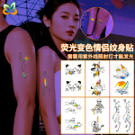 Size: 120mm × 76mm Durability: 3-5 days (waterproof and sweatproof) Material: 175g water transfer paper, vegetable ink, 0.025mm PET film, tattoo glue Style: YG-095, YG-096-097 (a total of 2 pieces), YG-098 - YG-106 (a total of 12 styles/sets) Packaging method: Individual packaging (hygienic and convenient) Core features: Fluorescent luminescence, matching styles for couples, safe and skin-friendly, water transfer printing, easy operation